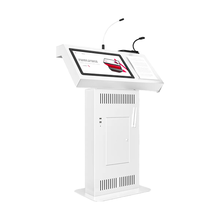 Ультрасовременная модель среди интерактивных трибун, которая включает в себя все самое необходимое для успешного проведения выступлений: профессиональный микрофон для качественной передачи звука, антивандальный корпус, яркий сенсорный экран, документ-камера для отображения необходимых документов на большом экране, дополнительные внешние разъемы. Помимо этого, на трибуне Voice Pro 19" предусмотрено место для размещения документов.