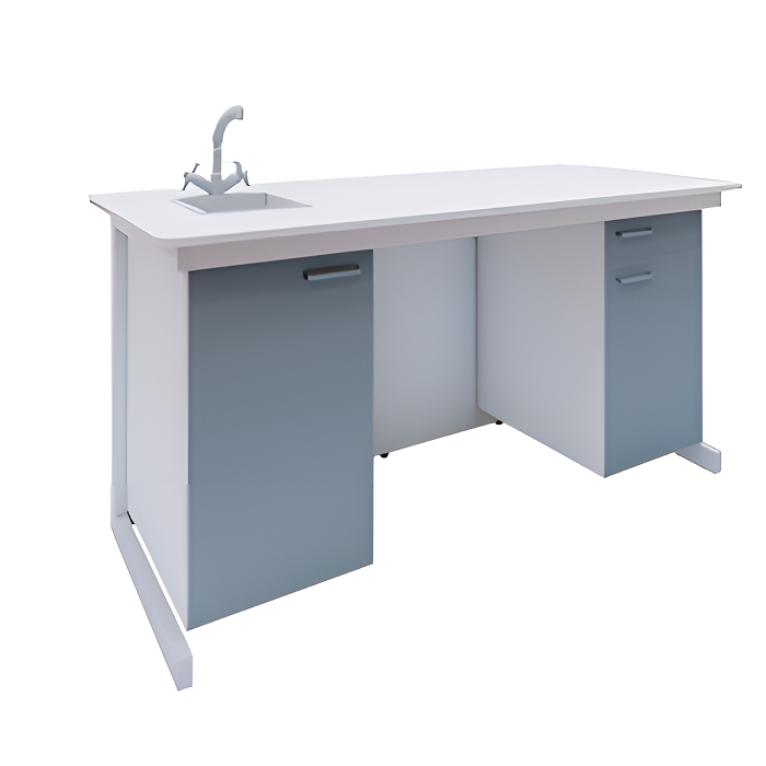 - Столешница стола изготовлена из ЛДСП с покрытием хим. стойким HPL толщиной не более 18 мм. В крайней части стола располагается мойка, изготовленная из Полиуретана, размер мойки не менее 240х140х140 мм..