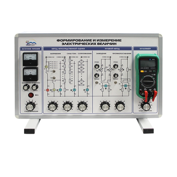 Комплект учебно-лабораторного оборудования "Установка для формирования и измерения электрических величин" предназначен для изучения средств и методов измерения электрических величин (сопротивления, напряжения, силы тока) и получения навыков многократных электрических измерений и оценки их результатов на основе методов непосредственной оценки и нулевого метода (способы замещения и противопоставления).
