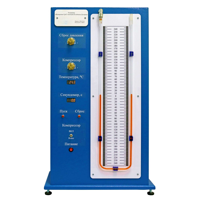 Позволяет экспериментально определять отношения теплоемкостей Cp/Cv методом Клемана-Дезорма для воздуха.