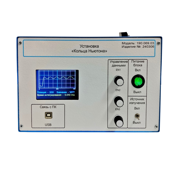 Приемный блок – линейка, состоящая из приборов с зарядовой связью. Линейка установлена в корпус. Конструкция блока позволяет изменять угол наклона линейки относительно оптической скамьи. Линейка подключена к блоку обработки данных.