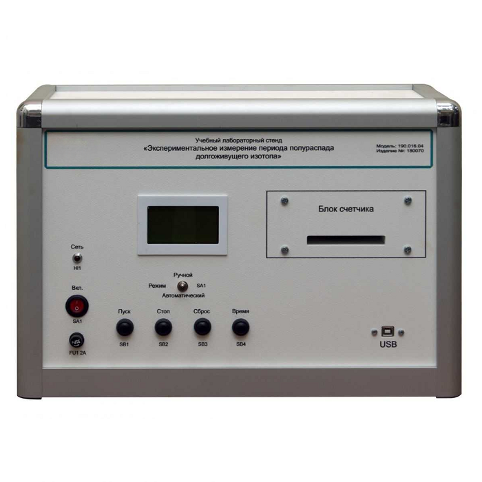 Экспериментальная установка является прототипом (учебной моделью) установки для исследования радиоактивного распада. Учебный лабораторный комплекс представляет собой действующую модель, функционально не отличающуюся от своего базового научного прототипа для исследования характеристик радиоактивного распада. Прибор позволяет воспроизвести серии измерений интенсивности излучения от радиоактивного источника 40К в соли KCl (количество актов радиоактивного распада), определить активность изотопа и вычислить период полураспада. В приборе отсутствует реальный радиоактивный источник излучения (используется его модель), а все результаты эксперимента содержатся в базе данных микропроцессора.
